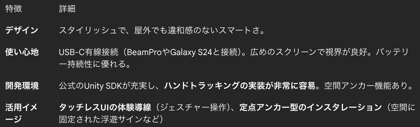 ARグラスの選択肢は多様ですが、展示会場などで「頭の位置・向き」を正確に追跡できる6DoF機能は、リアル空間とデジタルコンテンツを完全に融合させる鍵となります。