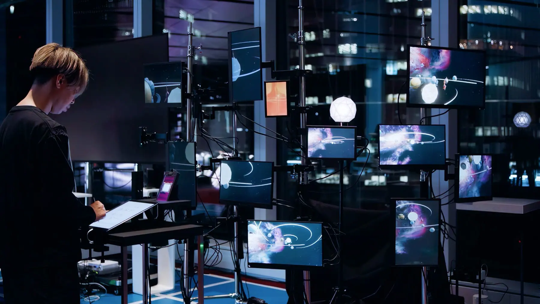 田中:見せ方の工夫として、知覚を統合するようなアプローチを意識しました。今回は大きなモニターをひとつ置くのではなく、複数のディスプレイを分散配置して、断片的な小窓のように演出しています。