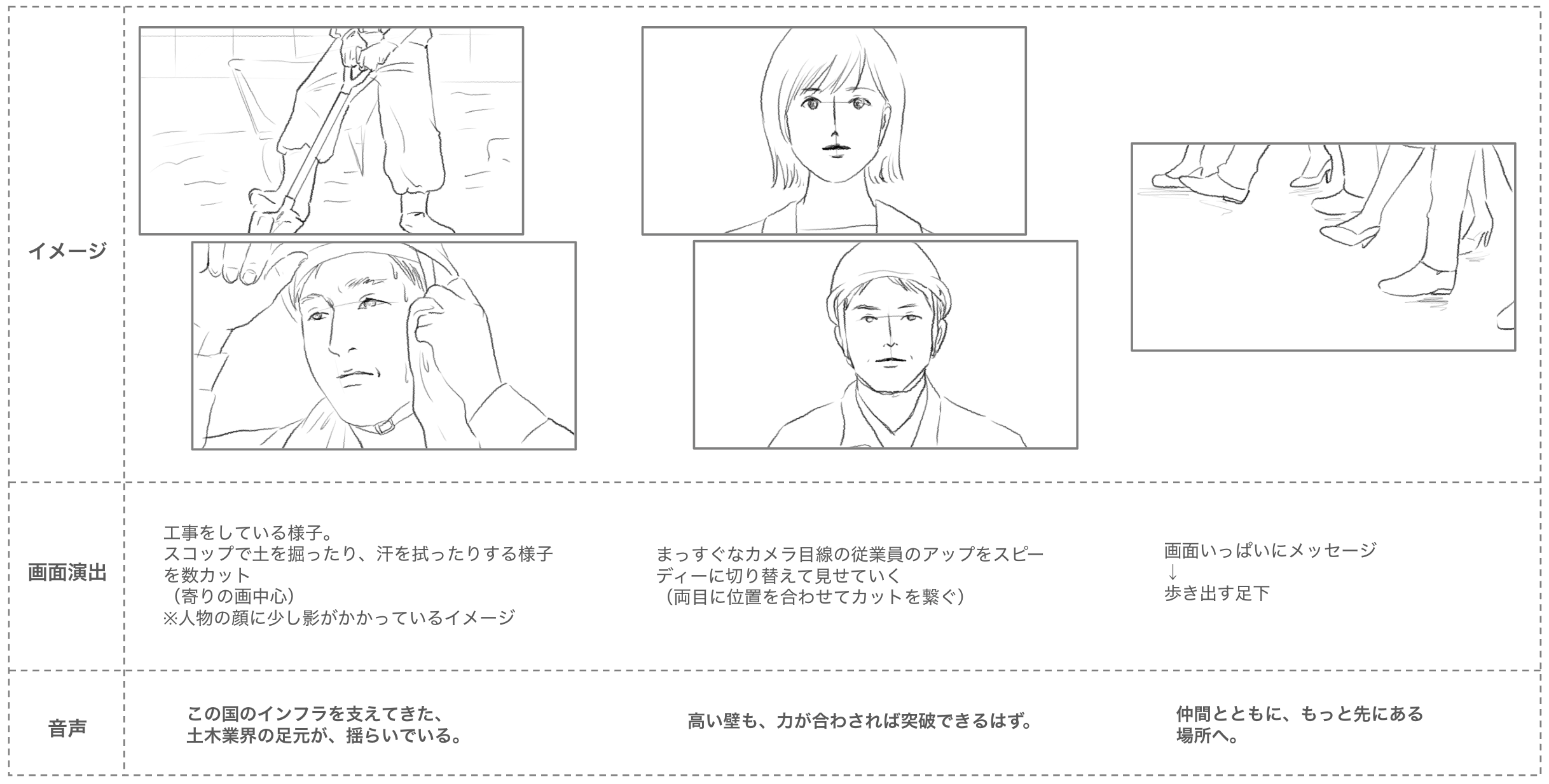 ▼演出コンテ抜粋版。実際はこれにカットナンバーや大まかな時間、音声情報(ナレーション文言や効果音タイミングなど)が入ります。