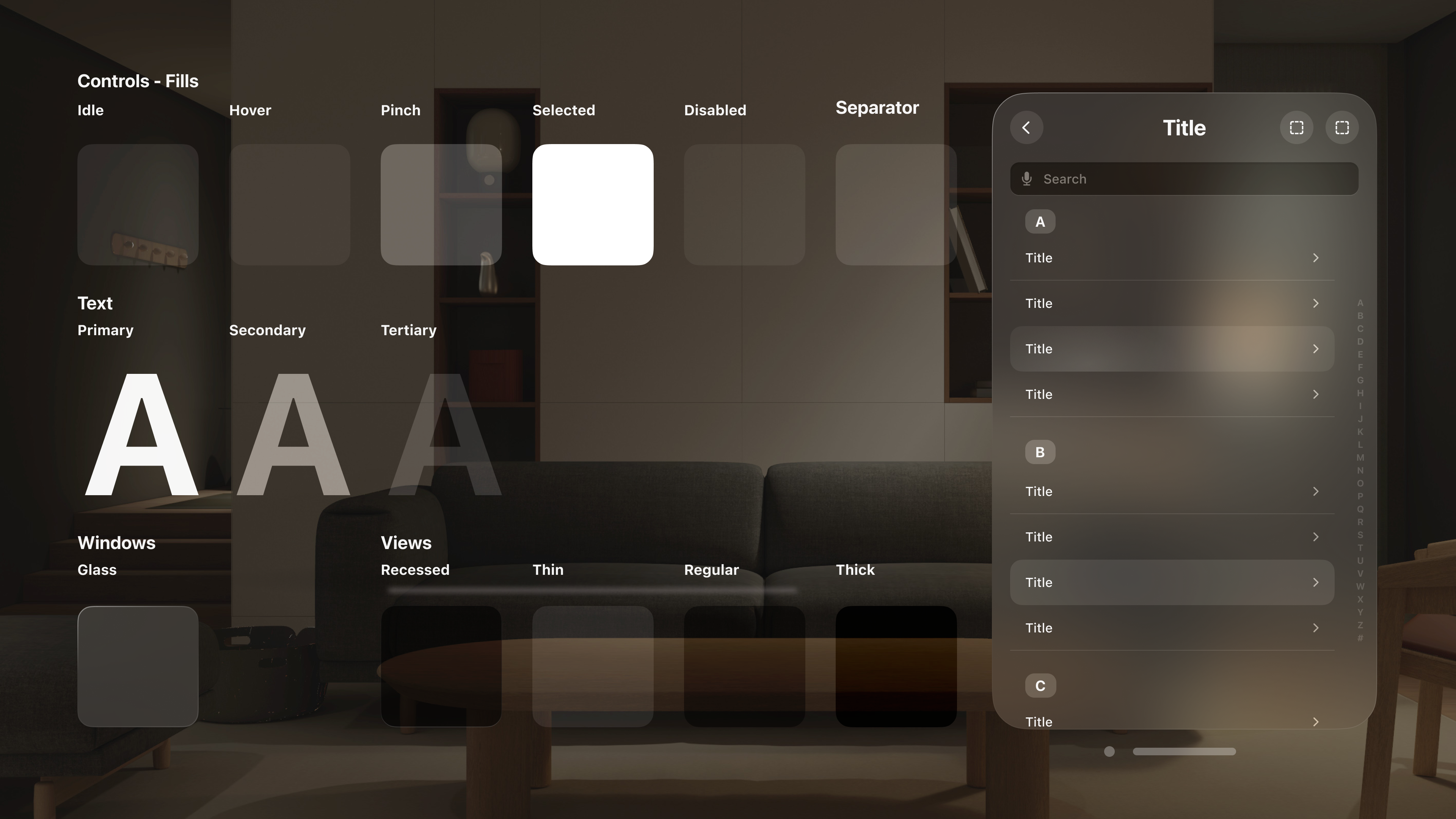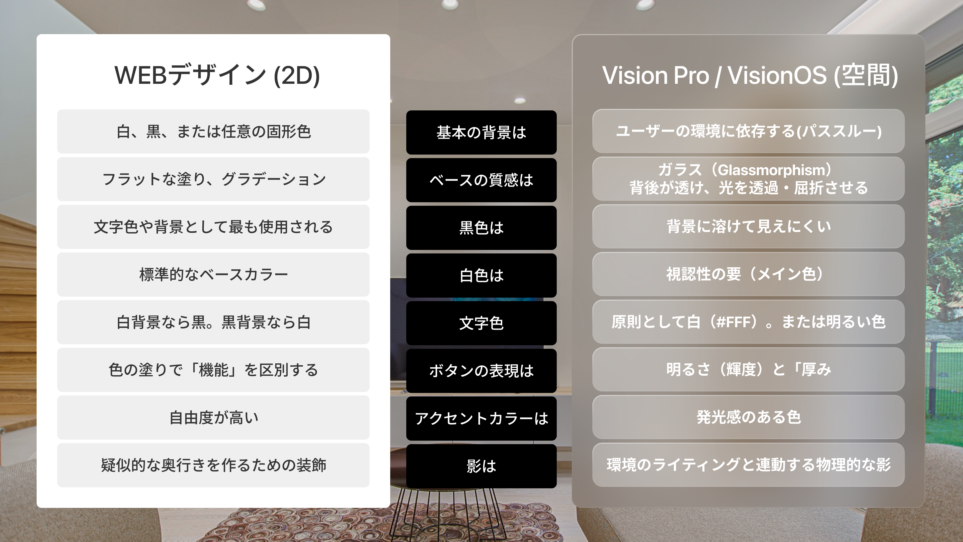 visionOSではグラスモーフィズム(Glassmorphism)が標準となります。背景は固定のカラーコードではなく、ユーザーの可変的な現実環境そのものです。