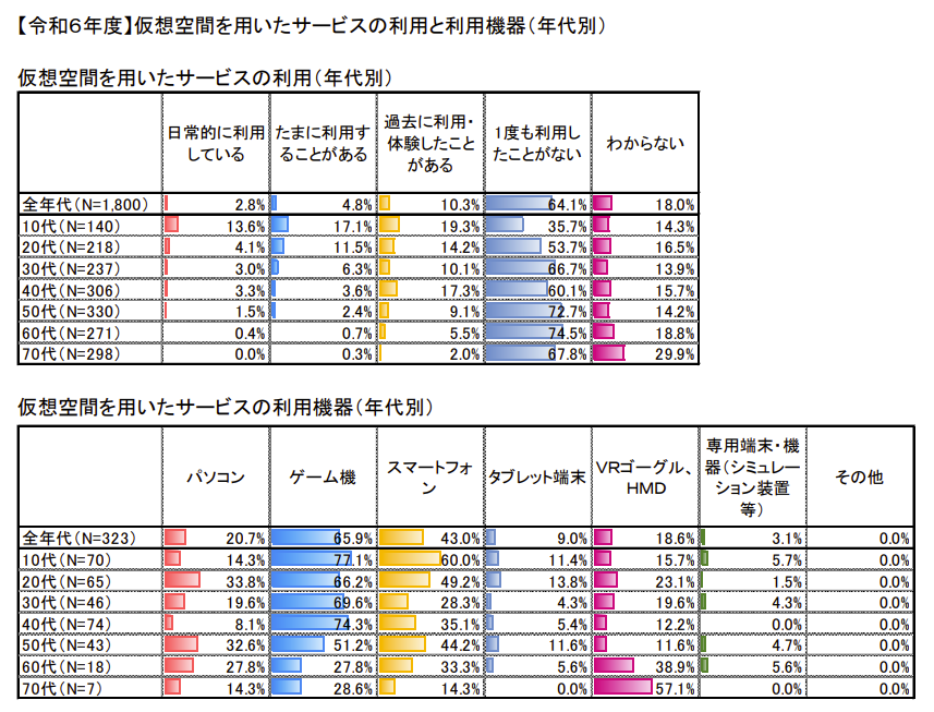 利用機器については、ゲーム機やスマートフォンの割合が高く、ゲームやWeb、アプリを通じて日常的に仮想空間に触れる機会が多いことが示唆されます。
