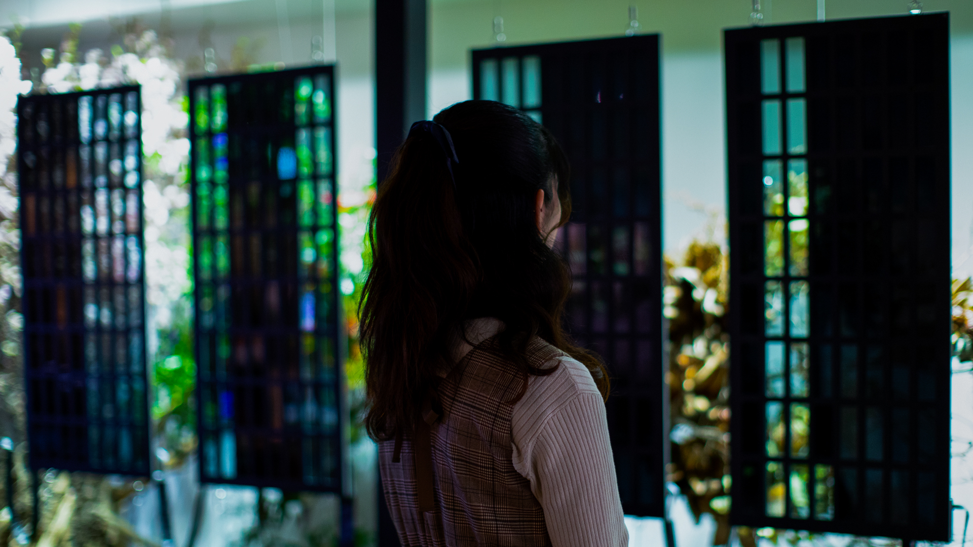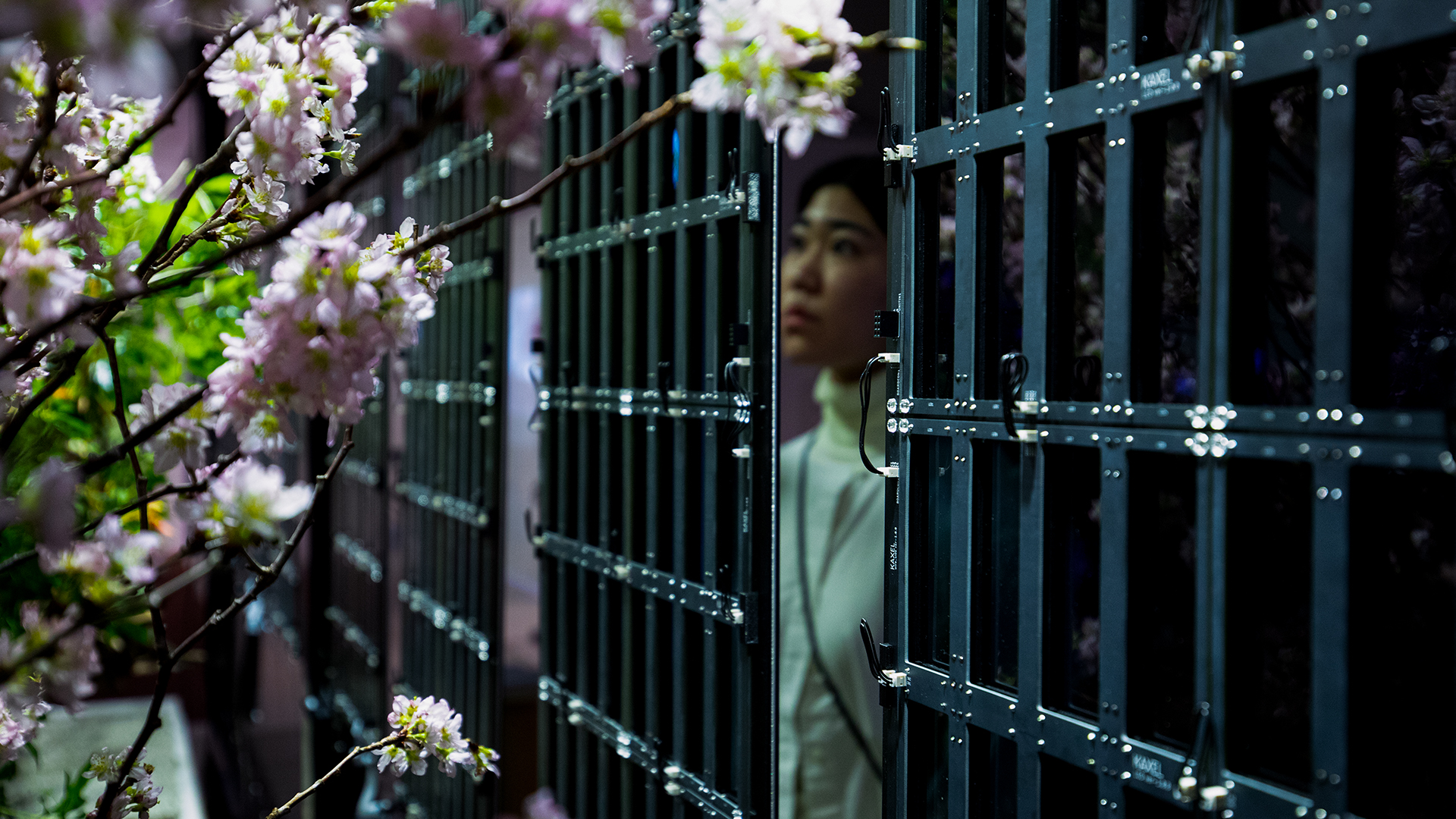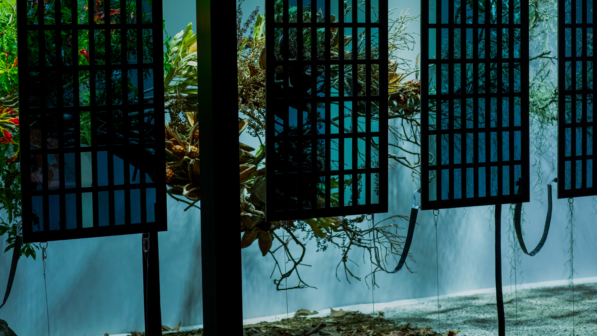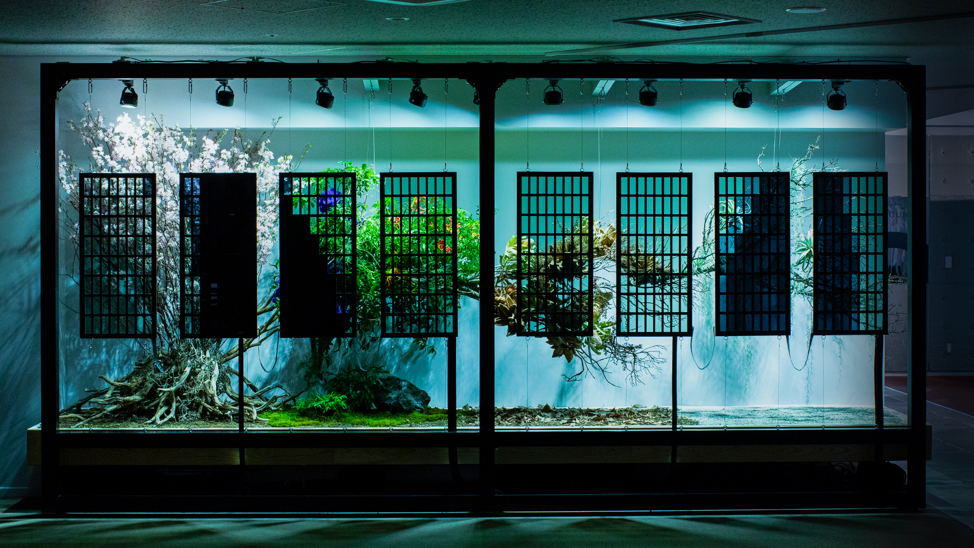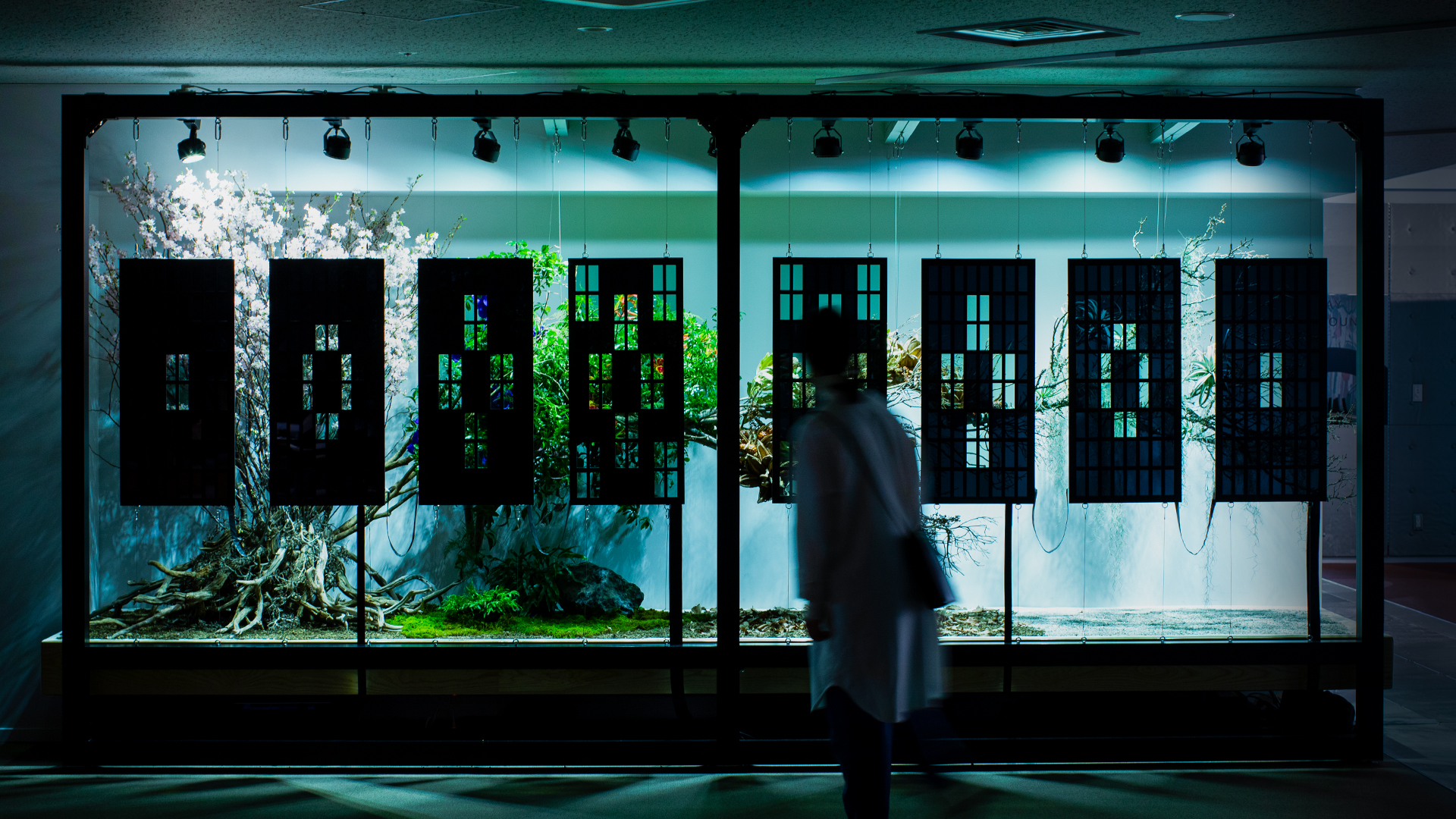 本作は日本の四季を「KAXEL(カクセル)」を通して表現します。8枚のKAXELと背後の植物で構成され、これら二つには「無機/有機」「デジタル/アナログ」といったコントラストがあり、その調和によって季節のうつろいを表現しています。KAXELには四季を連想させるアニメーションが流れ、1枚を通して見ると、掛軸のように季節の一瞬を切り抜き、8枚を通して見ると、屏風のように季節の変化を物語ります。
