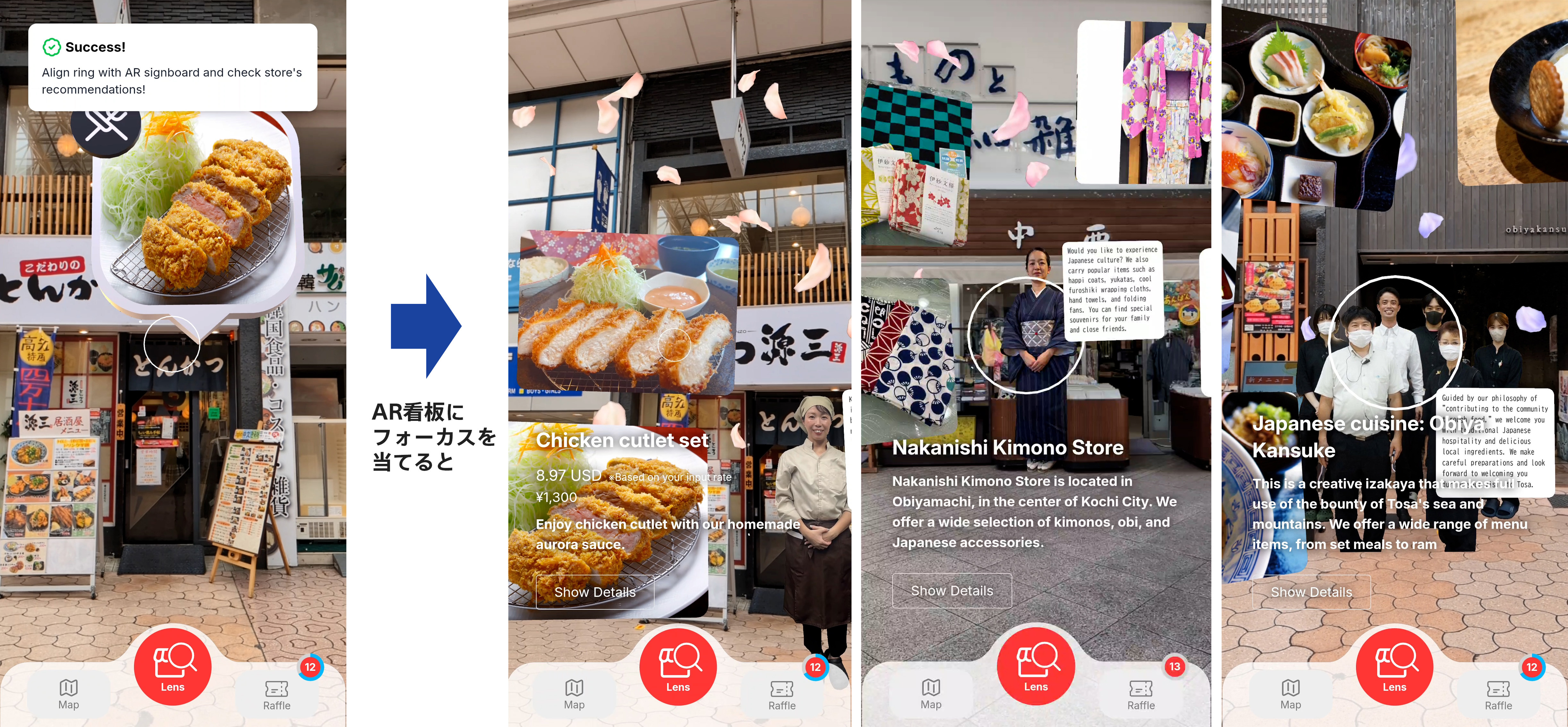 地方都市を訪れる外国人旅行者は、定番観光地だけでなく、街歩きの途中で偶然立ち寄った店舗で買いものを楽しむ姿も見られます。一方で、言語の壁や店舗情報の不足により、商店街での購買体験に躊躇するケースも少なくありません。「XR Street Lens in Obiyamachi」では、店舗前にXRで店員の方が笑顔で歓迎している様子やイチオシ商品を表示することで、こうした心理的ハードルをやわらげ、旅行者と地域との偶発的な出会いを促進します。XRならではの演出により、訪問先での体験をより豊かで記憶に残るものへと導きます。