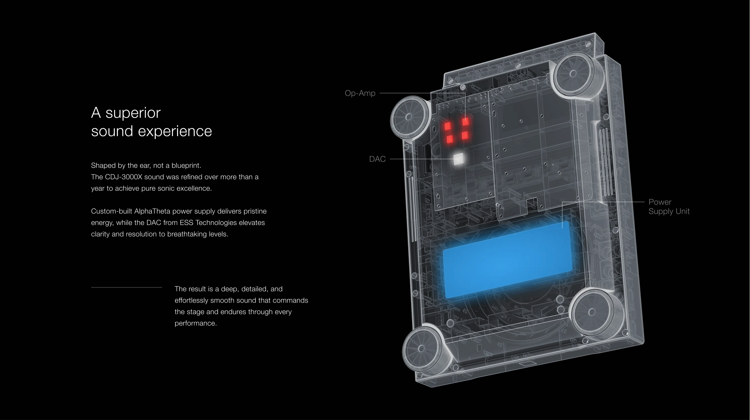 伝統ある系譜を受け継ぎ、満を持して登場した「AlphaTheta」ブランド初のフラッグシップ機「CDJ-3000X」。これまでの歩みを一つの物語として昇華させながら、未来を切り拓く先進的な造形とスペックを余すことなく表現しています。ウェブサイト上では、実機が放つ圧倒的な存在感を余さず伝えるため、実写素材にこだわったビジュアルを展開。プロフェッショナルの道具としての確かな質感を感じ取り、実際のプレイをより身近に想像させる構成を目指しました。