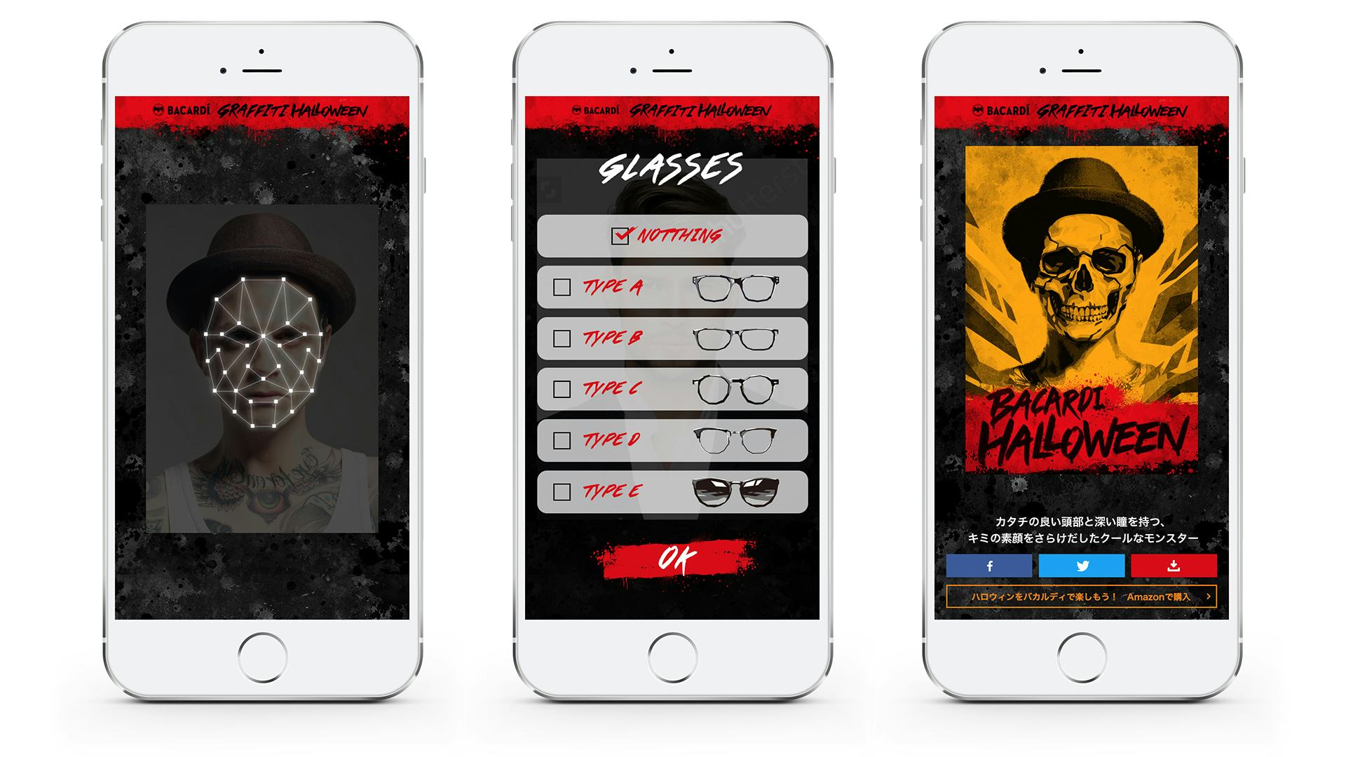 ハロウィンを体験できるバカルディのキャンペーンサイトを制作しました。このキャンペーンサイトで、自分自身の顔写真をアップロードすると、目、鼻、輪郭などの特徴を取得し、その特徴を元にしたユーザー自身のモンスターアートを生成し、SNSでシェアすることができます。街中の仮装だけでなくSNS上でも仮装を楽しめる体験を作りました。