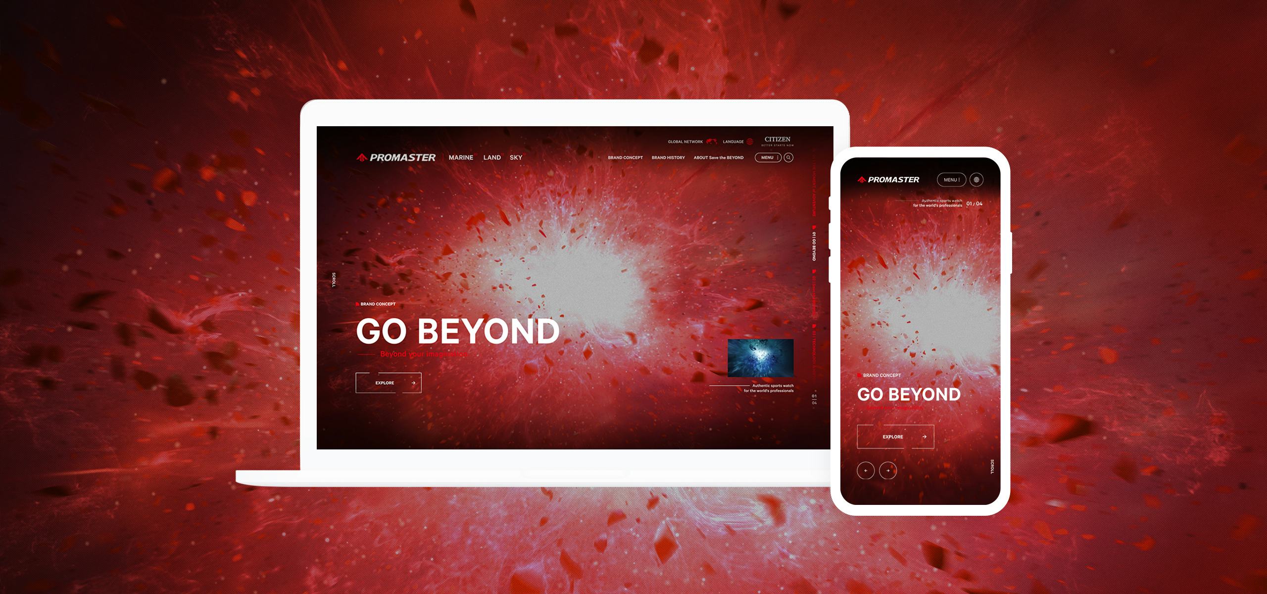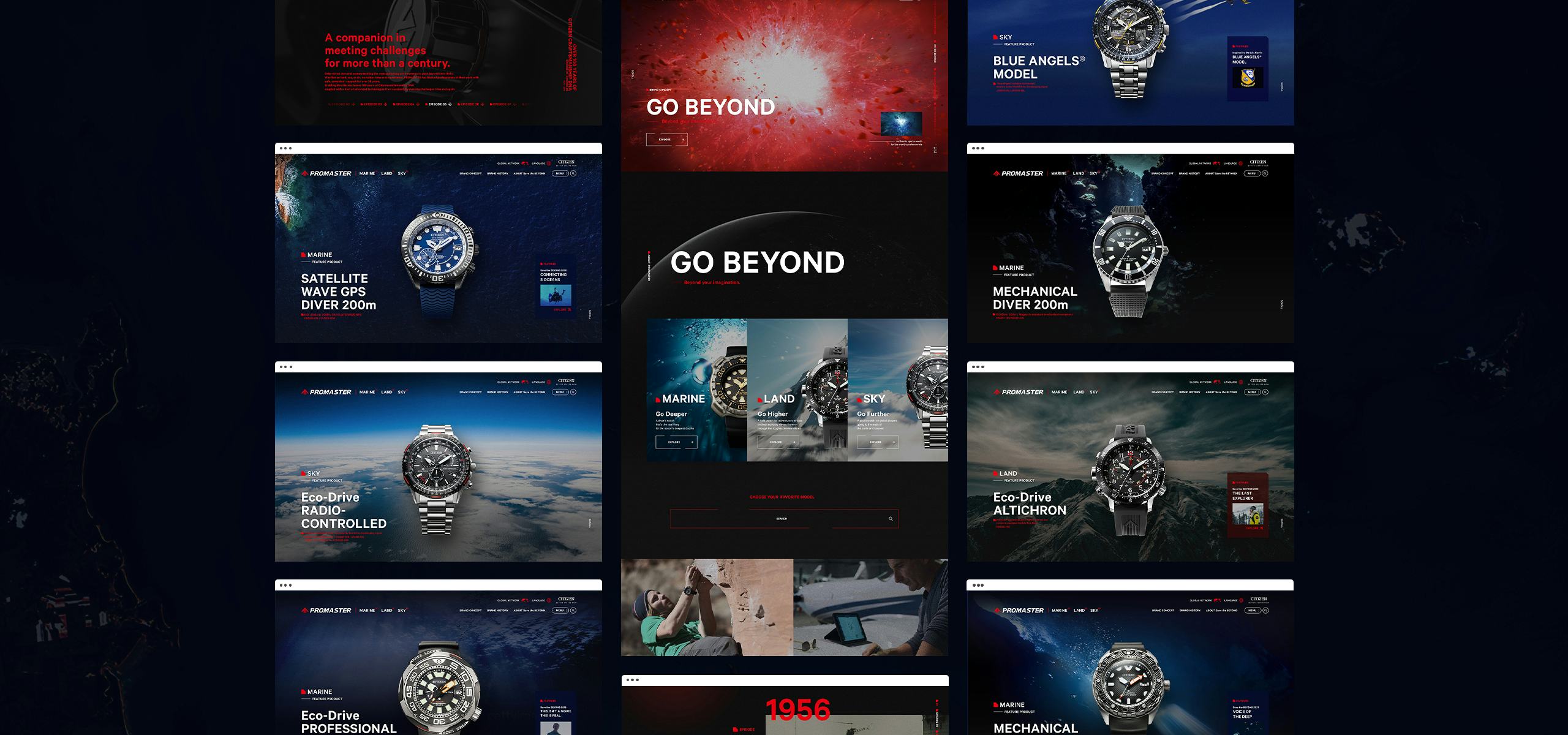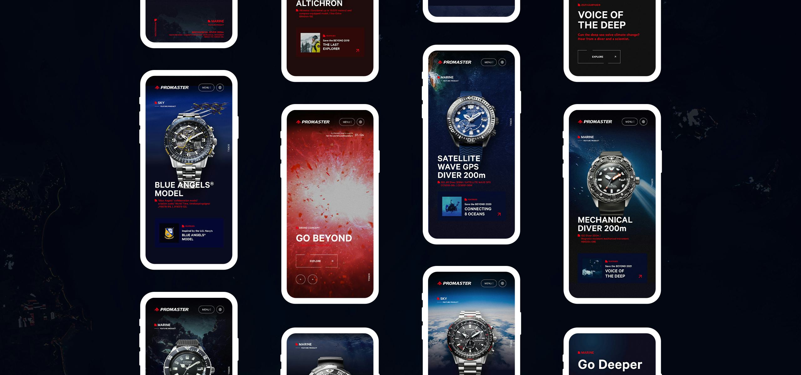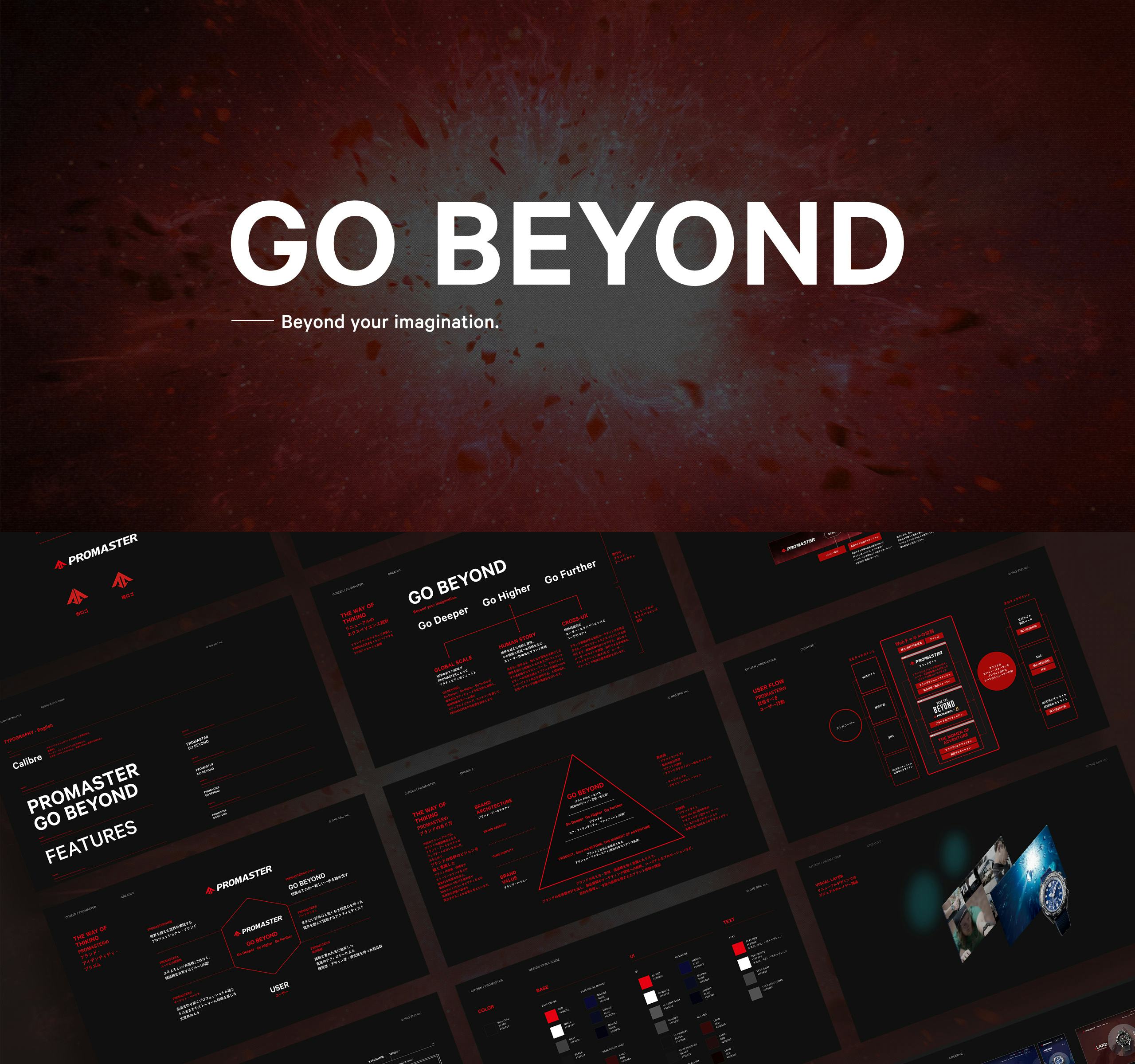 「GO BEYOND」の力強いブランドタグラインを起点に、CITIZENと「PROMASTER(プロマスター)」が100年以上の時を掛けて磨きあげてきたテクノロジーの歴史と挑戦、ユニークなコンセプトと世界観を持った製品、「Save the BEYOND」の未来に向かって挑戦するリアルなストーリー性を一貫性のあるブランド体験に統合し、ブランドの過去・現在・未来を感じさせるコンテクストをつくりあげています。