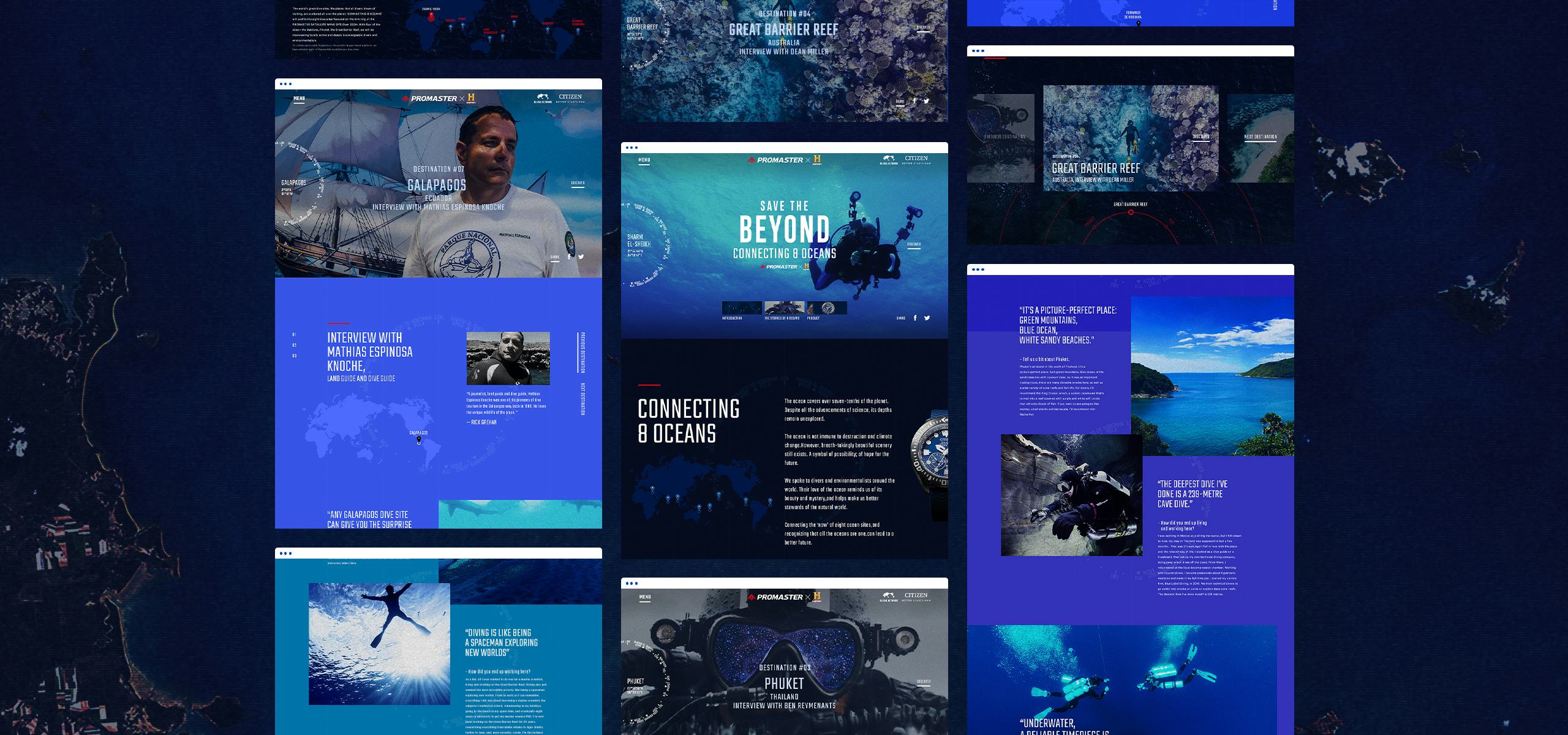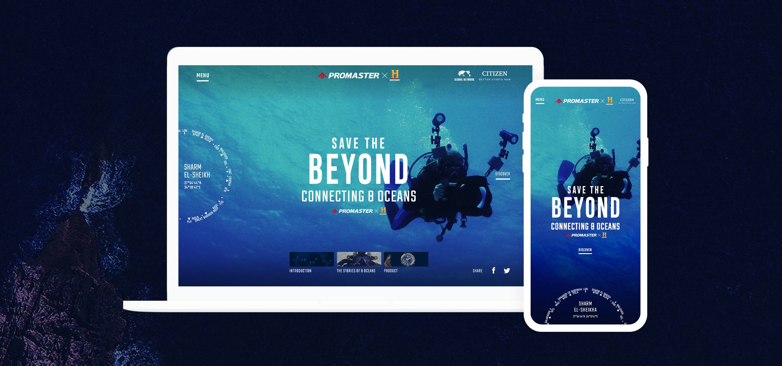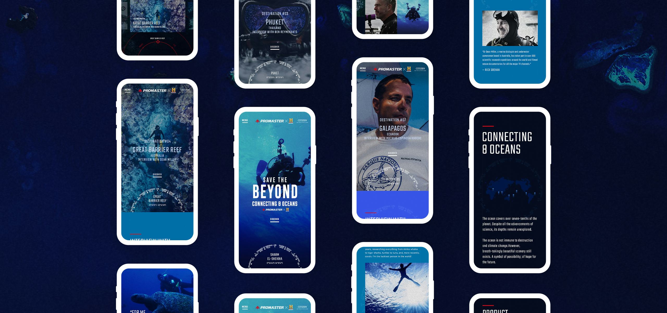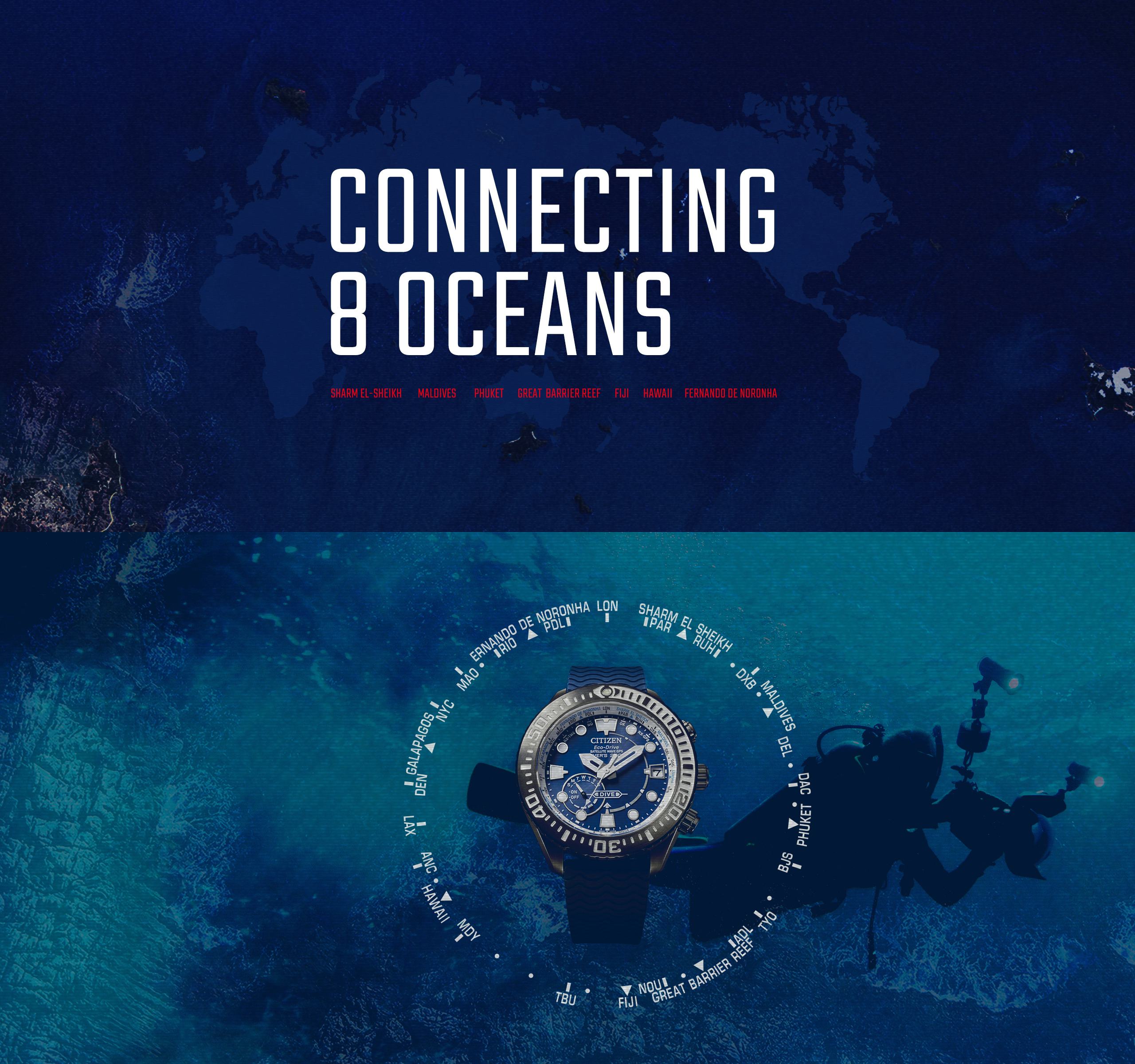 CITIZENのスポーツウオッチブランド「PROMASTER」の2020年のグローバル・キャンペーン「Save the BEYOND/CONNECTING 8 OCEANS」の、コンセプト設計、コンテンツ企画、デザインビジュアル制作、全8ヶ国語に及ぶサイト内情報設計からフロントエンド実装まで、クリエイティブワーク全般を担当させていたしました。
