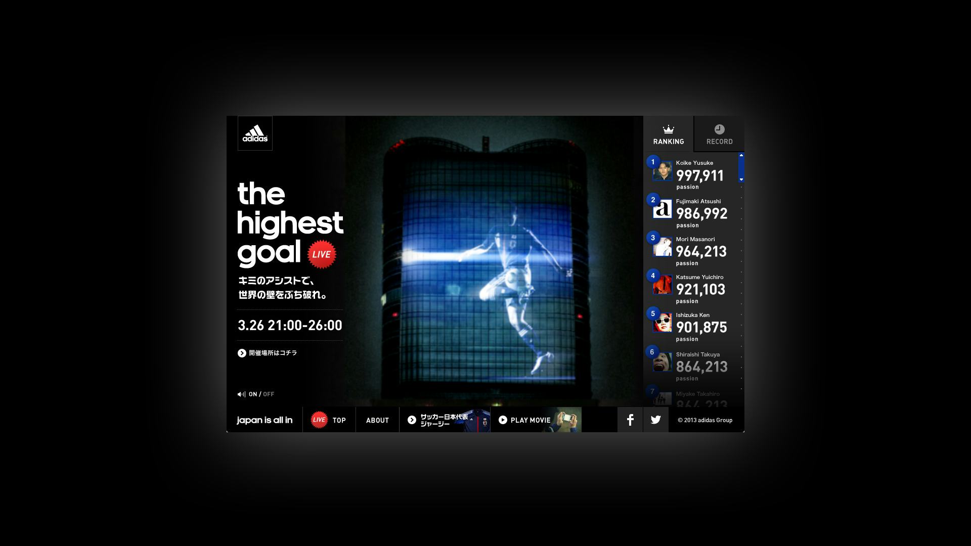 ユーザーにはfacebookのログインが必須とされ、加速度センサーを元にして競われたスローインのスコアをサイト横で紹介れます。投影の模様は特設サイトで生中継され、多くのユーザーが参加しました。