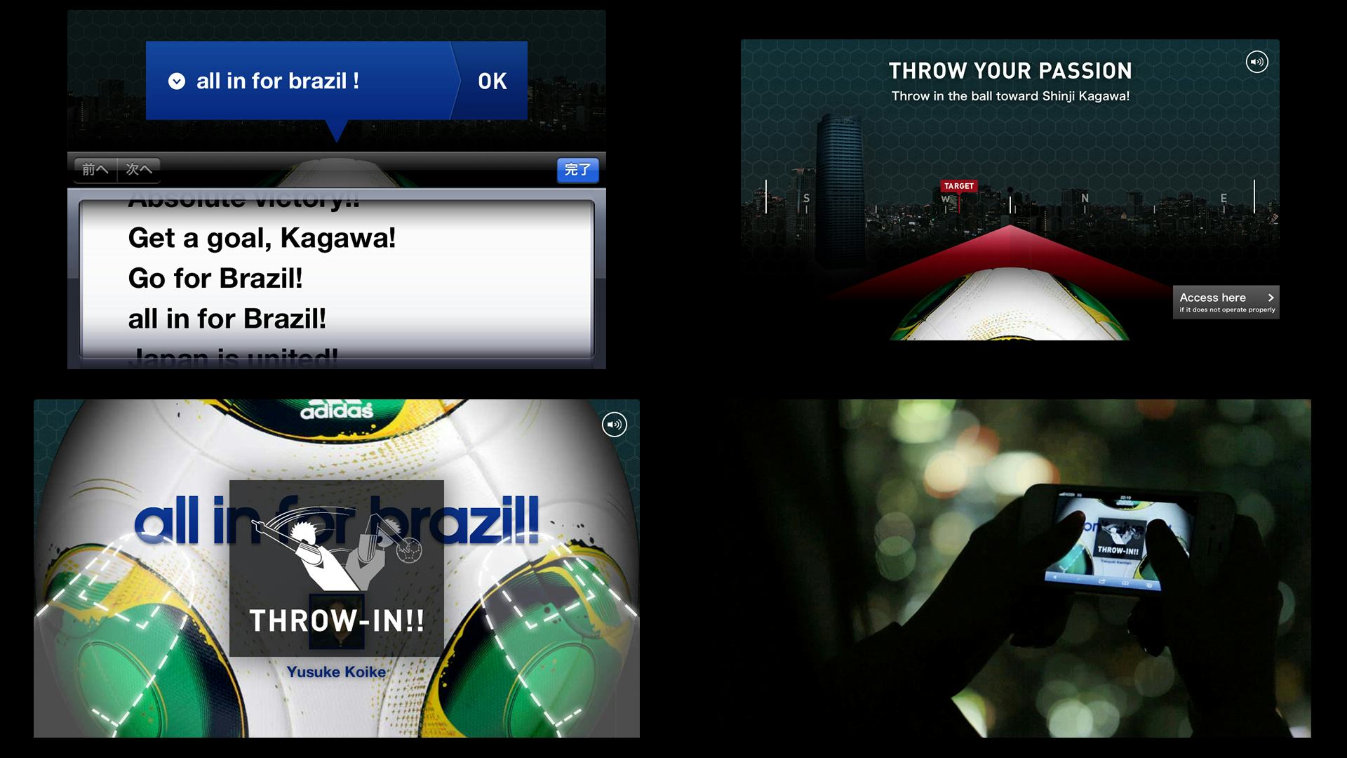 2013年3月26日のW杯ブラジル大会アジア最終予選サッカー日本代表ヨルダン戦に合わせて実施された盛り上げ施策。同日夜、六本木のアディダス本社ビルの壁面に投影された巨大な香川真司選手に向けて、自分のスマートフォンから応援メッセージと共にボールをスローインすると、香川選手がシュートを決めブラジル大会への壁を打ち破る映像が流れます。