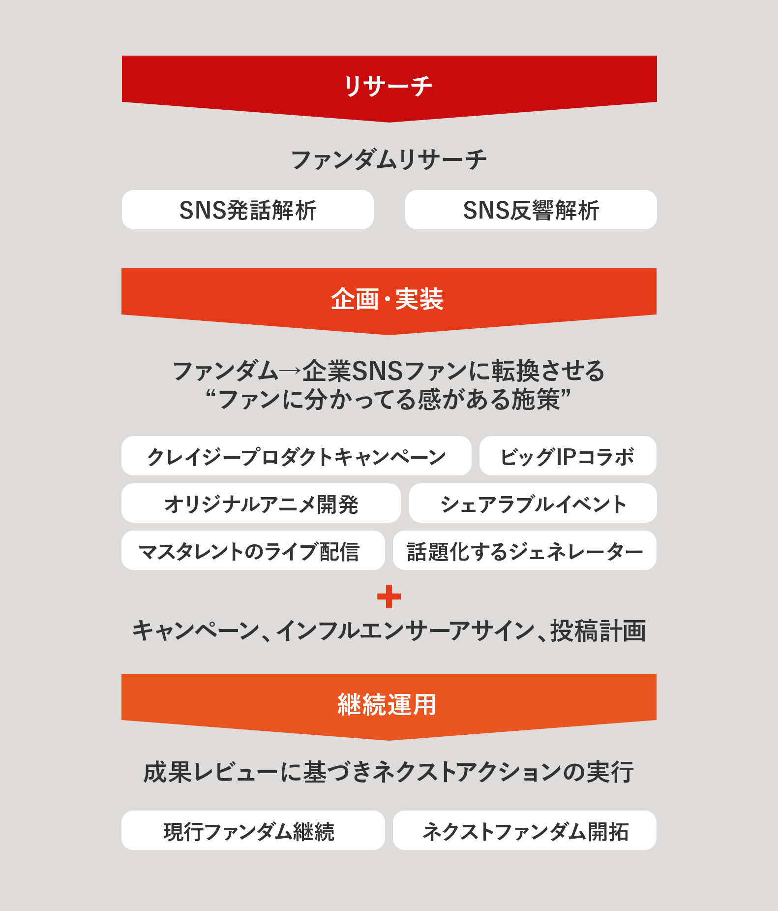D2C が提供する、「SNSファンダムコンサルティング」では、単なるアカウント運用に留まらず、詳細なリサーチに基づき、アニメ開発やIPコラボ、ライブ配信等の施策を通じて新規ファンを固定ファンへと定着させます。
